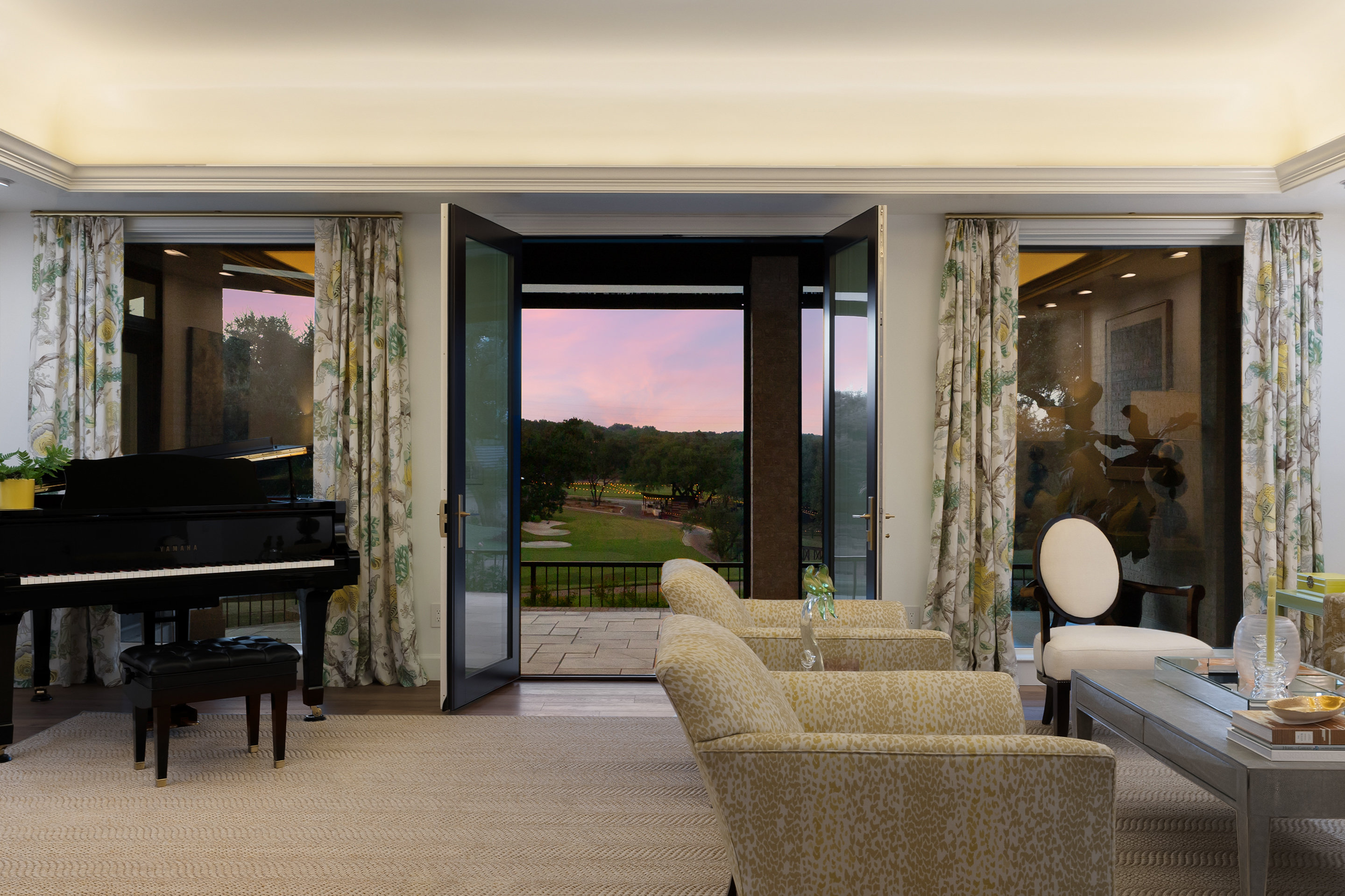 There are two light-filled living areas downstairs, with a fireplace and formal dining, and an elevator to the second level, where the airy designs and classical details for each space continue. The second primary suite upstairs features a private balcony overlooking endless views of the greens. There are also two additional bedrooms on the second level, including an optional living/game room featuring a wet bar, and a study.
