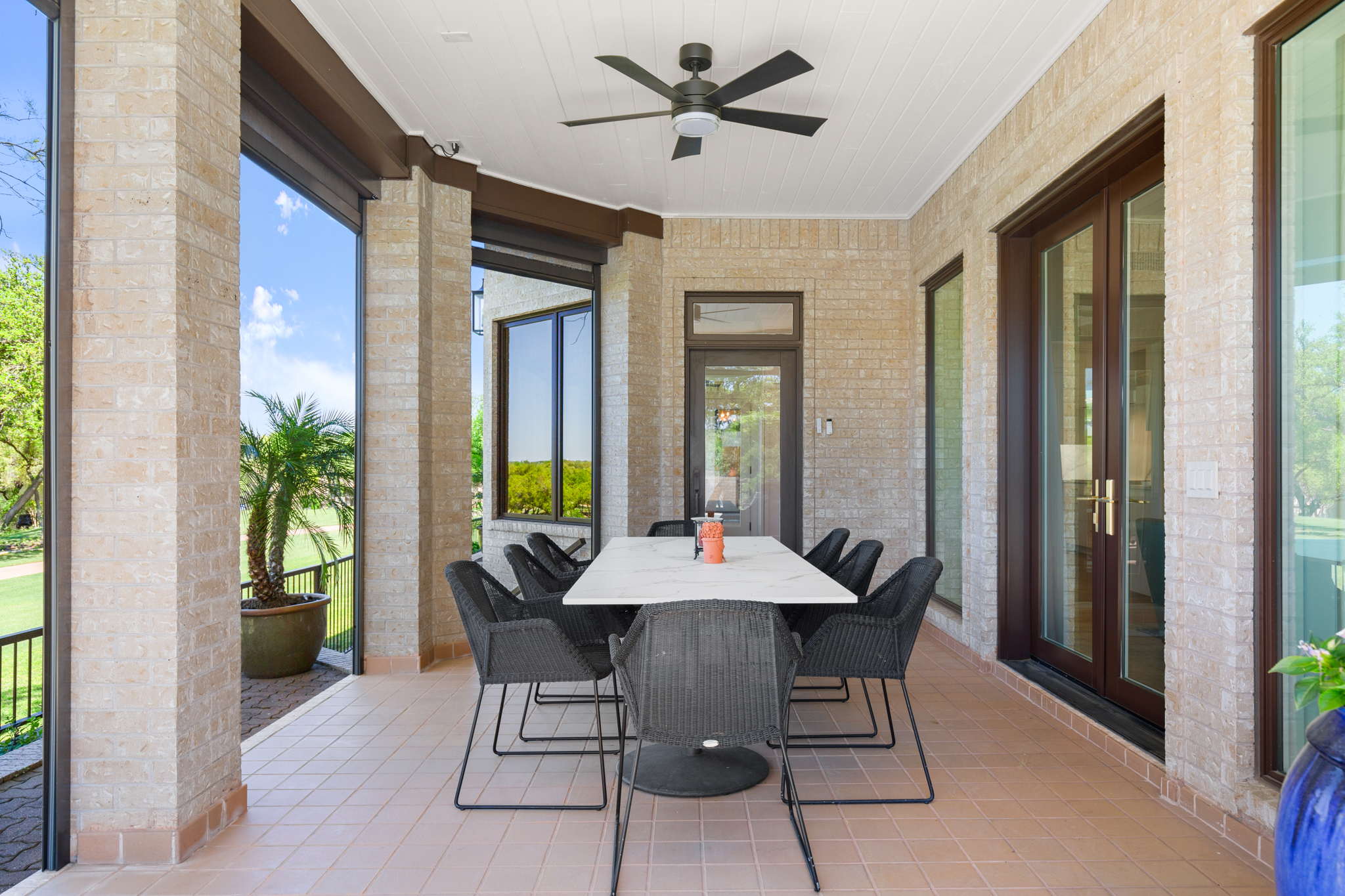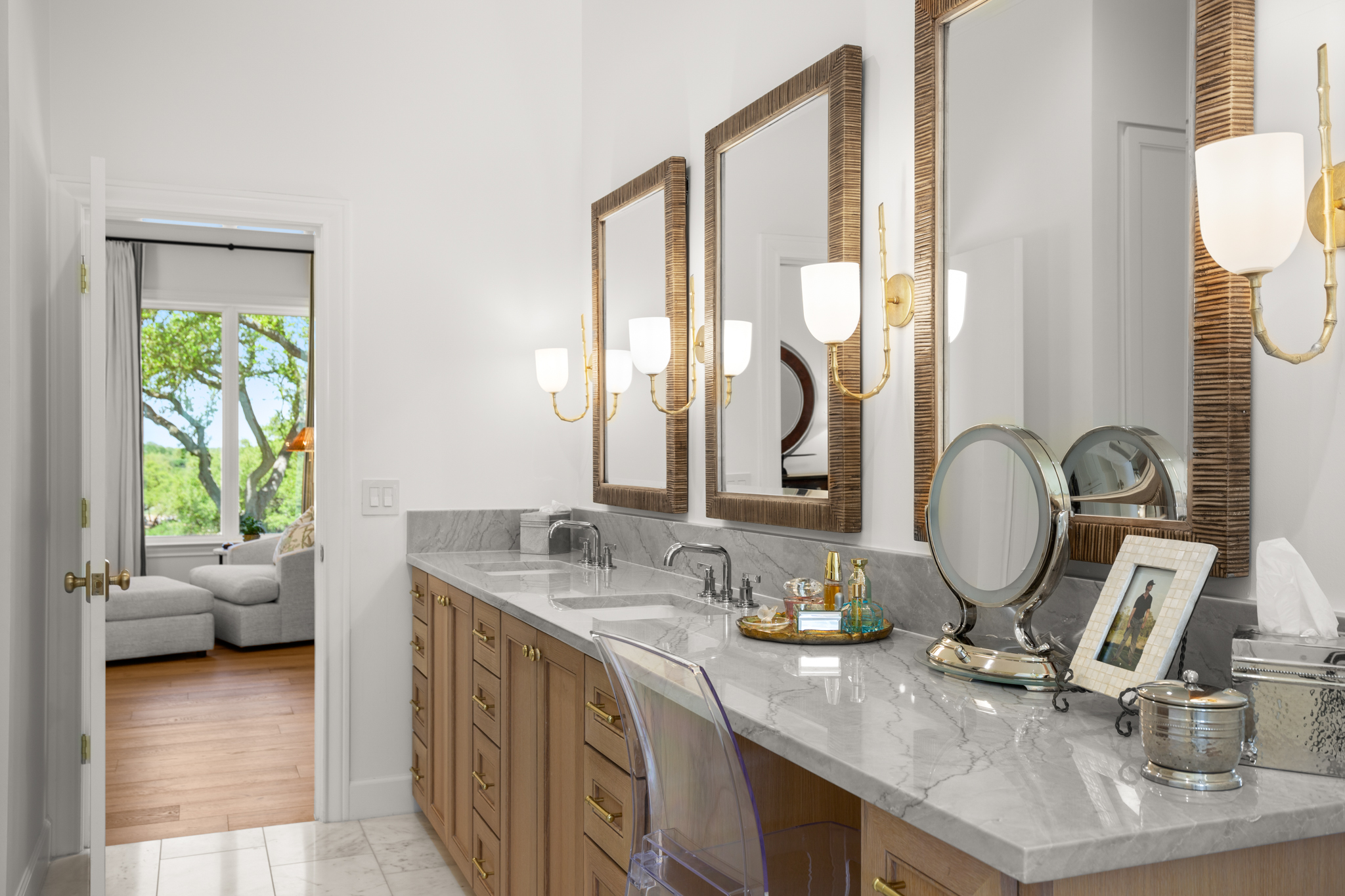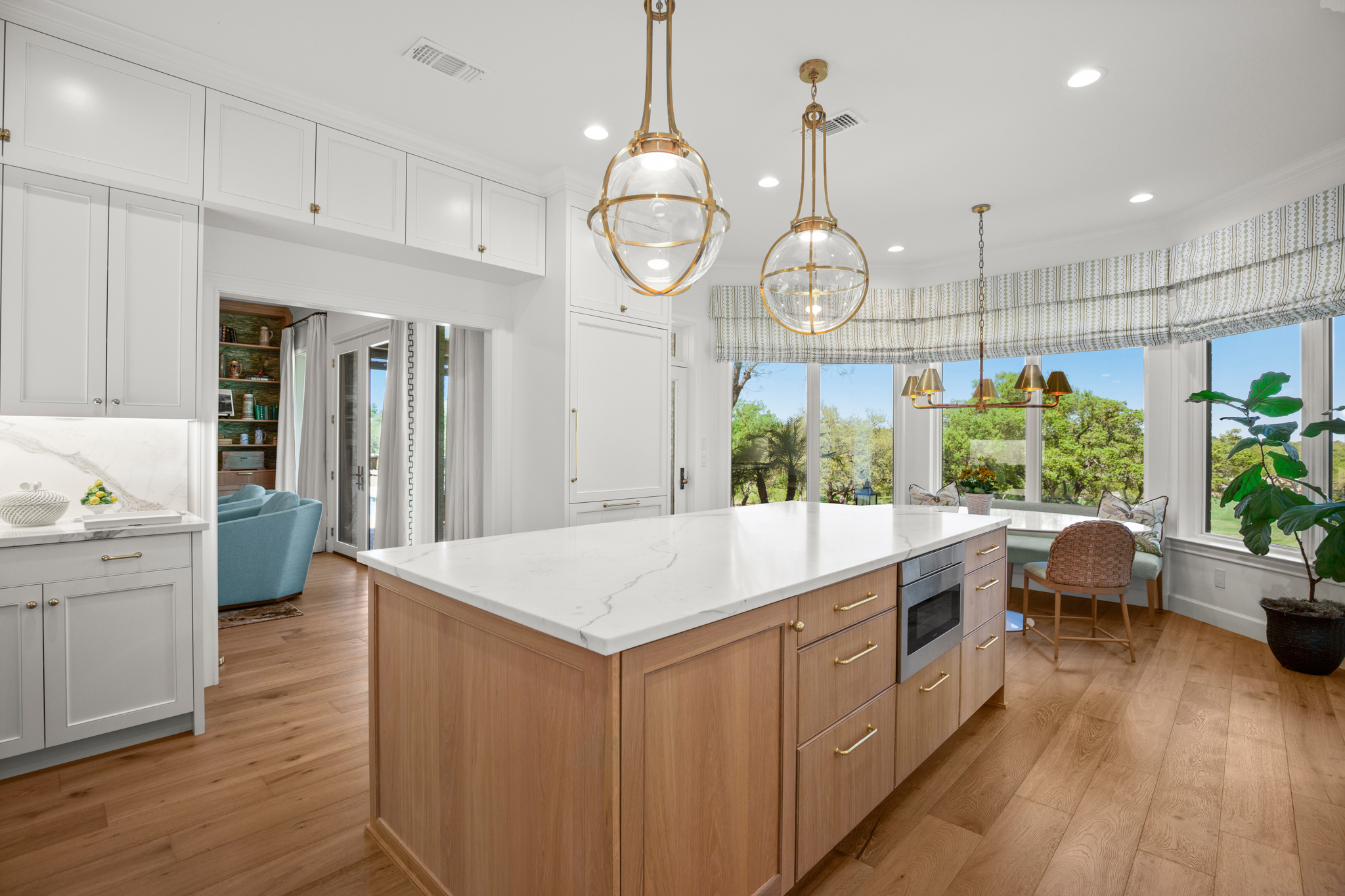 There are two light-filled living areas downstairs, with a fireplace and formal dining, and an elevator to the second level, where the airy designs and classical details for each space continue. The second primary suite upstairs features a private balcony overlooking endless views of the greens. There are also two additional bedrooms on the second level, including an optional living/game room featuring a wet bar, and a study.