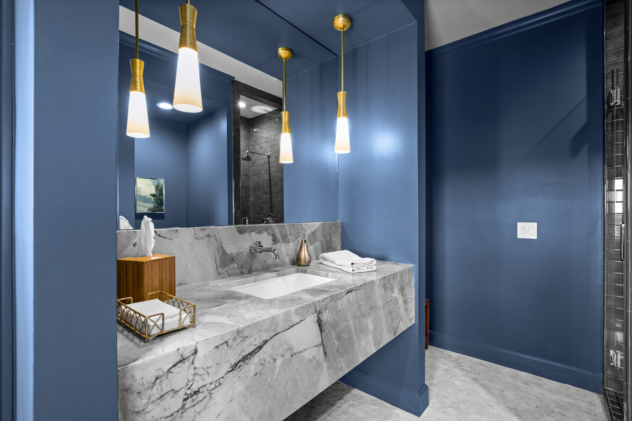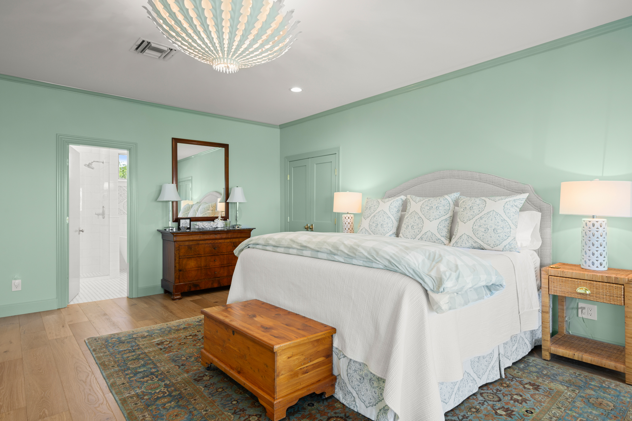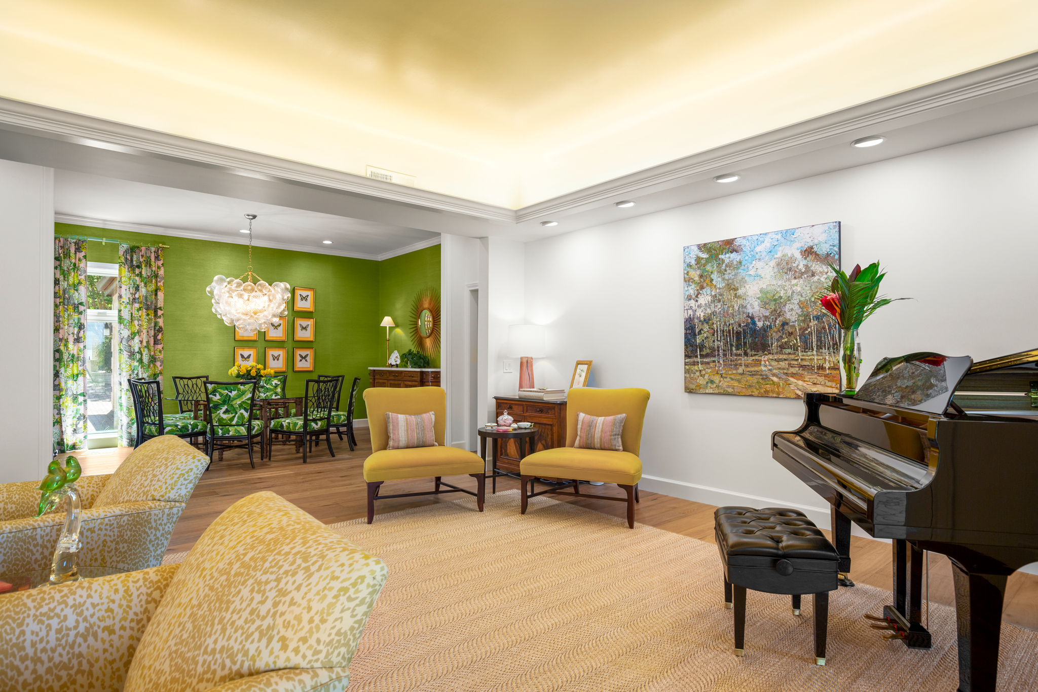There are two light-filled living areas downstairs, with a fireplace and formal dining, and an elevator to the second level, where the airy designs and classical details for each space continue. The second primary suite upstairs features a private balcony overlooking endless views of the greens. There are also two additional bedrooms on the second level, including an optional living/game room featuring a wet bar, and a study.
